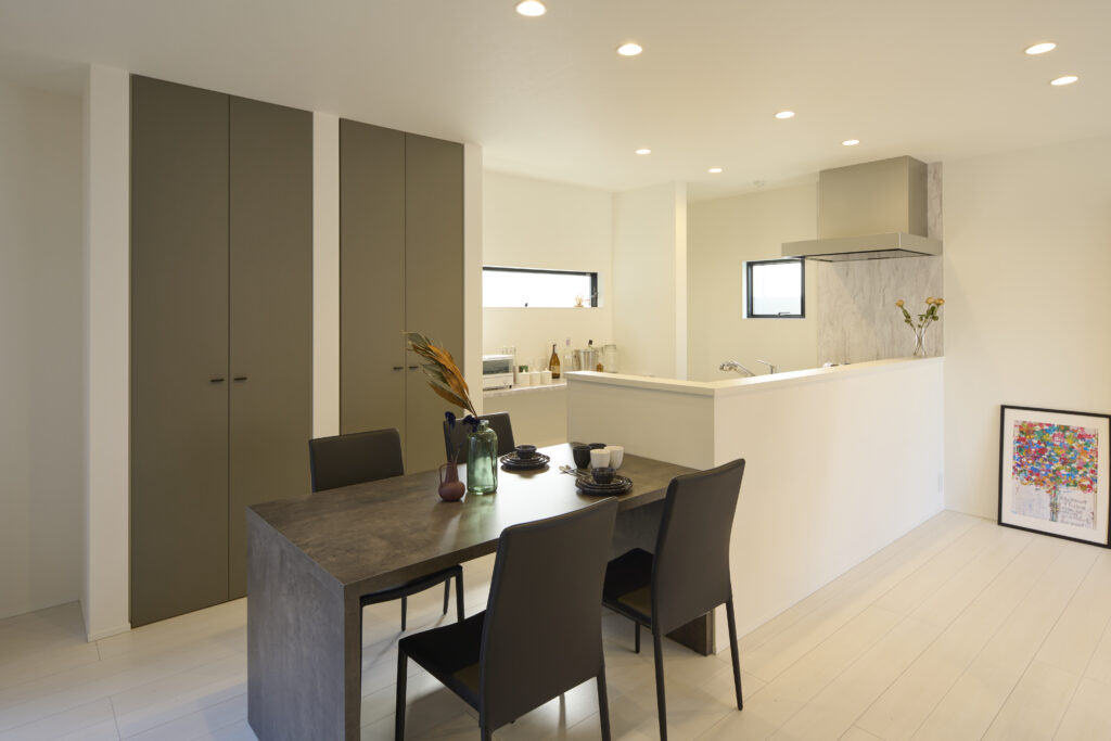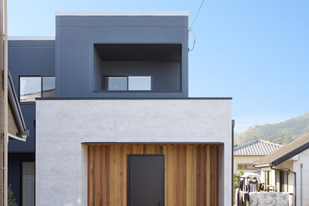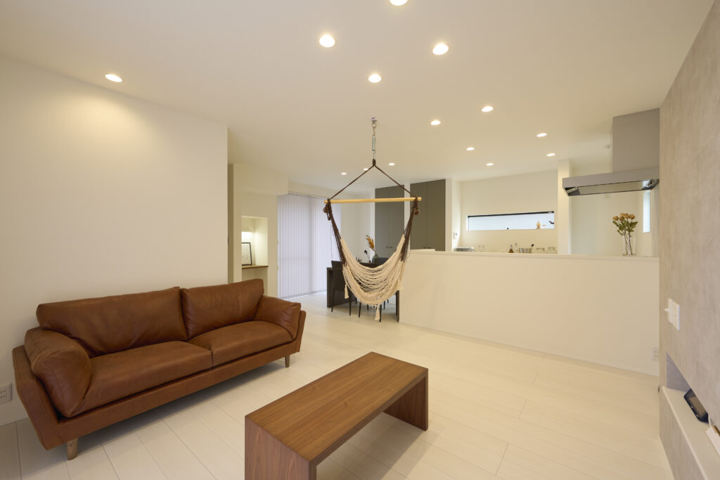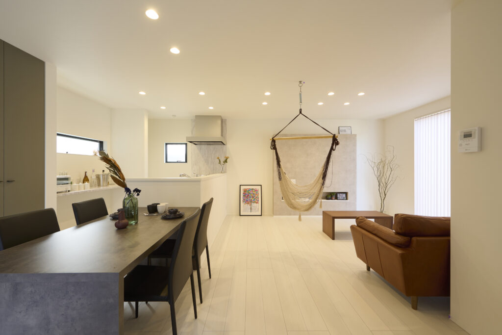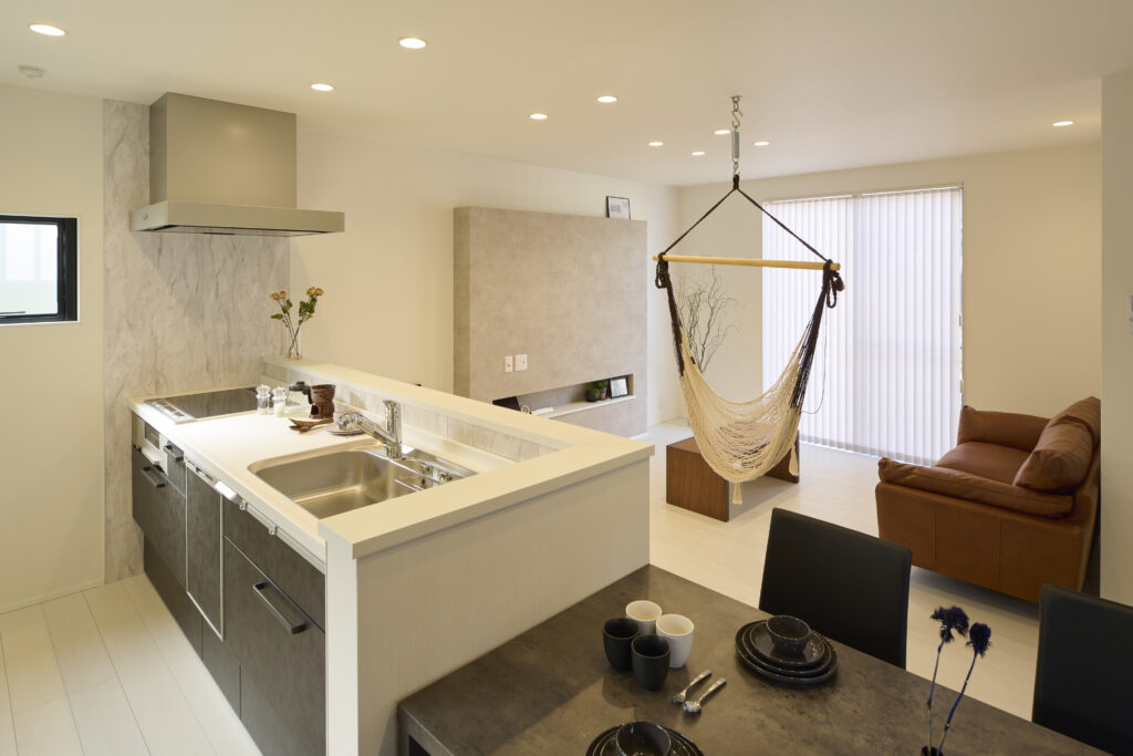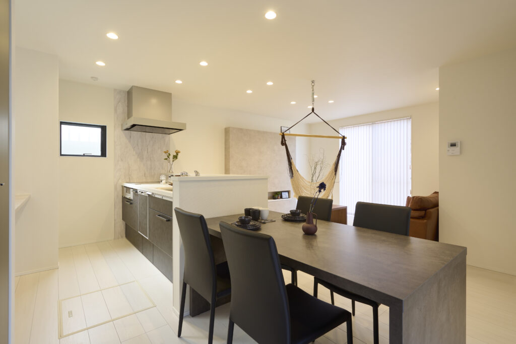 モダンな石目調とモノトーンの住宅 コンパクトながら理想をギュッと詰めた「賢いプラン」の住まいができました。28.5坪という広さでも、玄関・ダイニング・洗面所など、必要な収納はしっかり確保。中庭やリビングに吊り下げたハンモックなど、心地よく過ごせる工夫も取り入れました。モダンな石目調とモノトーンの内装が目を惹きます。