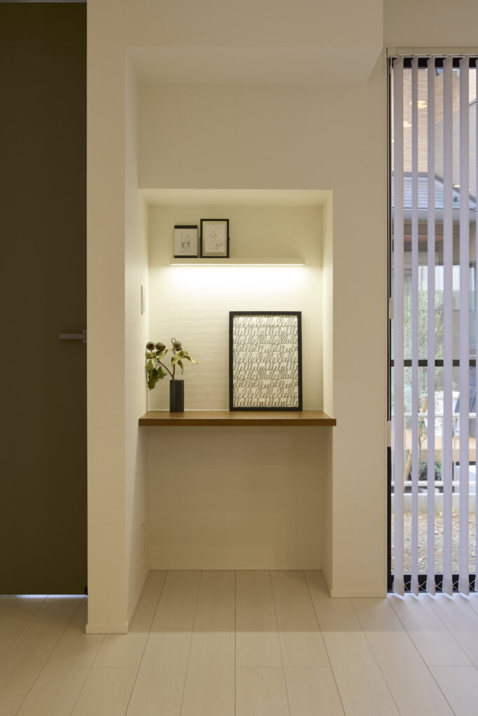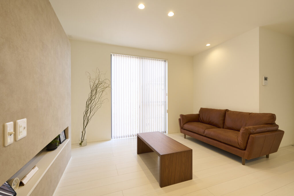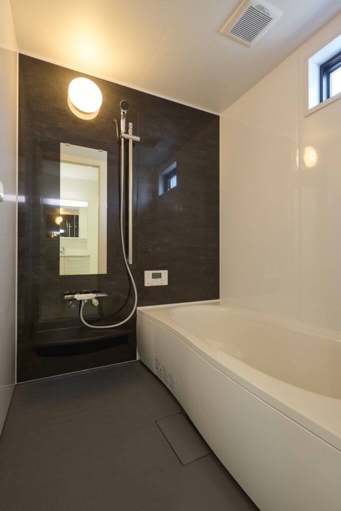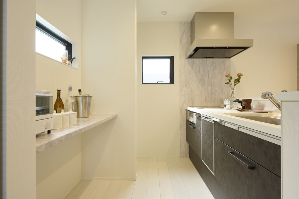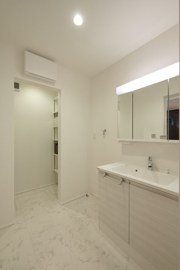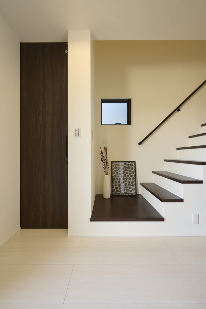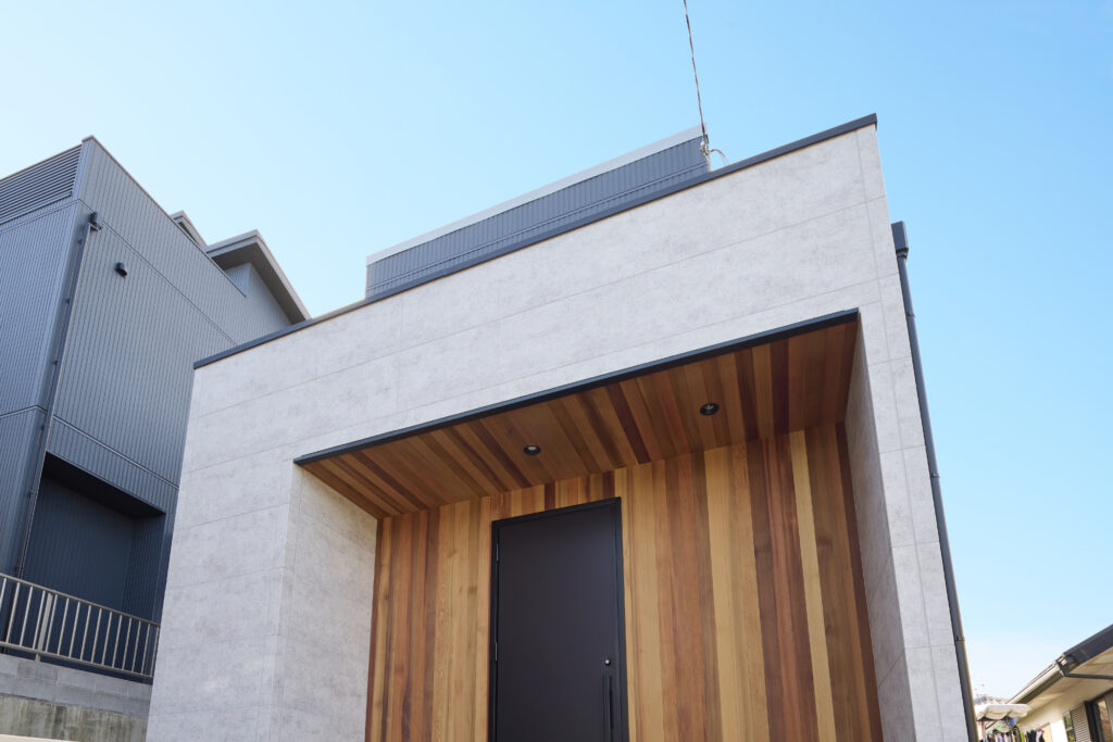 モダンな石目調とモノトーンの住宅 コンパクトながら理想をギュッと詰めた「賢いプラン」の住まいができました。28.5坪という広さでも、玄関・ダイニング・洗面所など、必要な収納はしっかり確保。中庭やリビングに吊り下げたハンモックなど、心地よく過ごせる工夫も取り入れました。モダンな石目調とモノトーンの内装が目を惹きます。