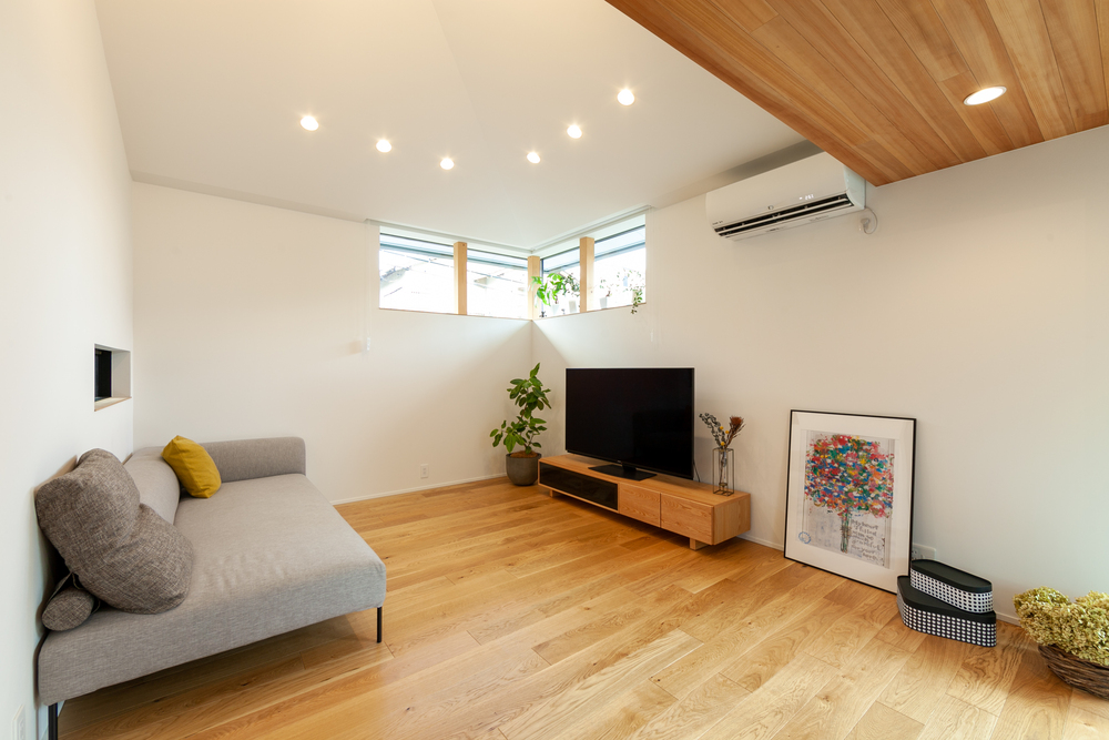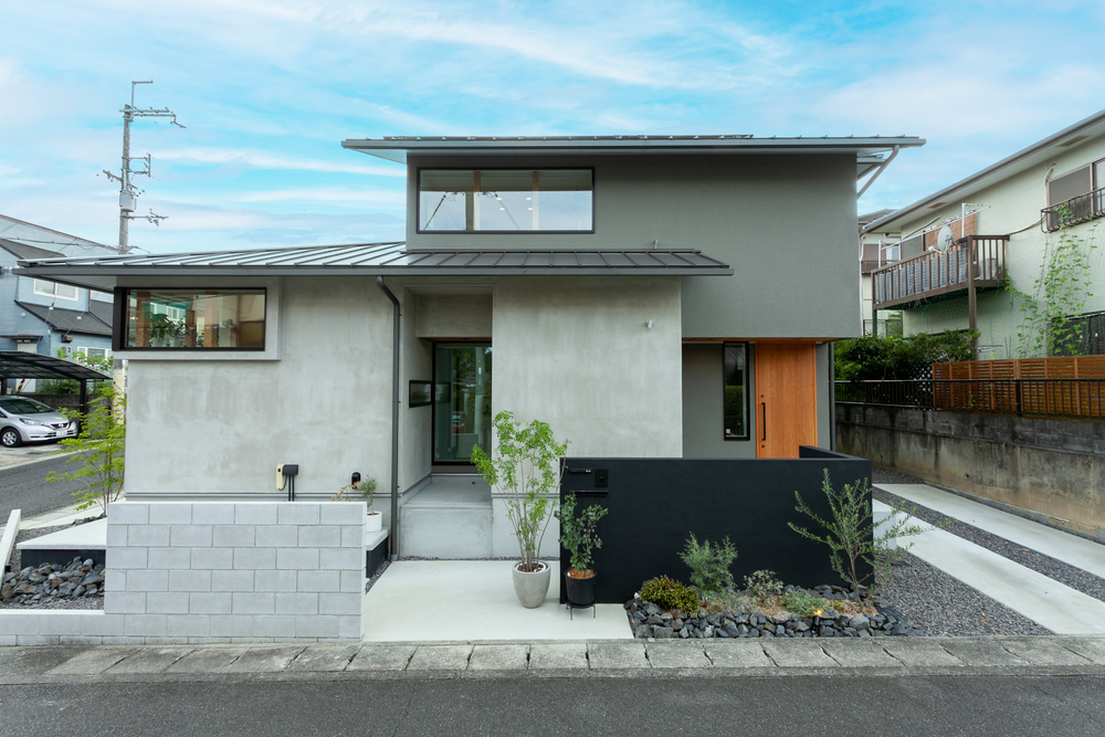 木のぬくもりと自然の光を感じる家 塗り壁とモルタル仕上げを組み合わせたモダンな外観に仕上がりました。玄関にはなぐり仕上げの床材を採用。玄関収納を別に設けることで空間がスッキリとしています。角地のため人の通りが多い土地ですがプライバシーを守りつつ、自然の光がやさしく降り注ぐリビングはダイニングにかけてL型の間取りにすることで、キッチンからリビングの奥まで目が届き、繋がりのよい空間です。デザイン性・機能性ともに充実したすてきなお家になりました。