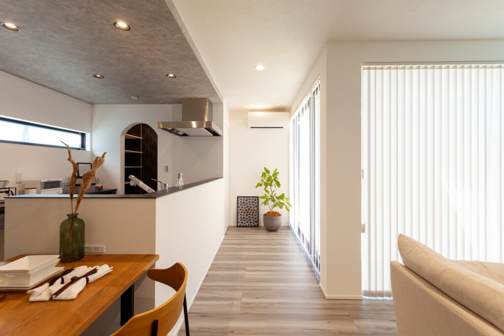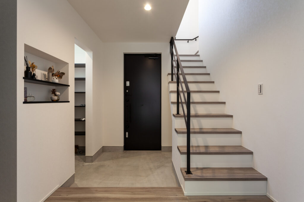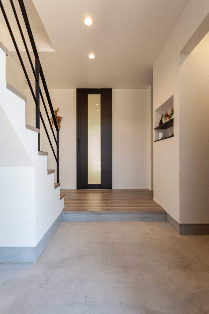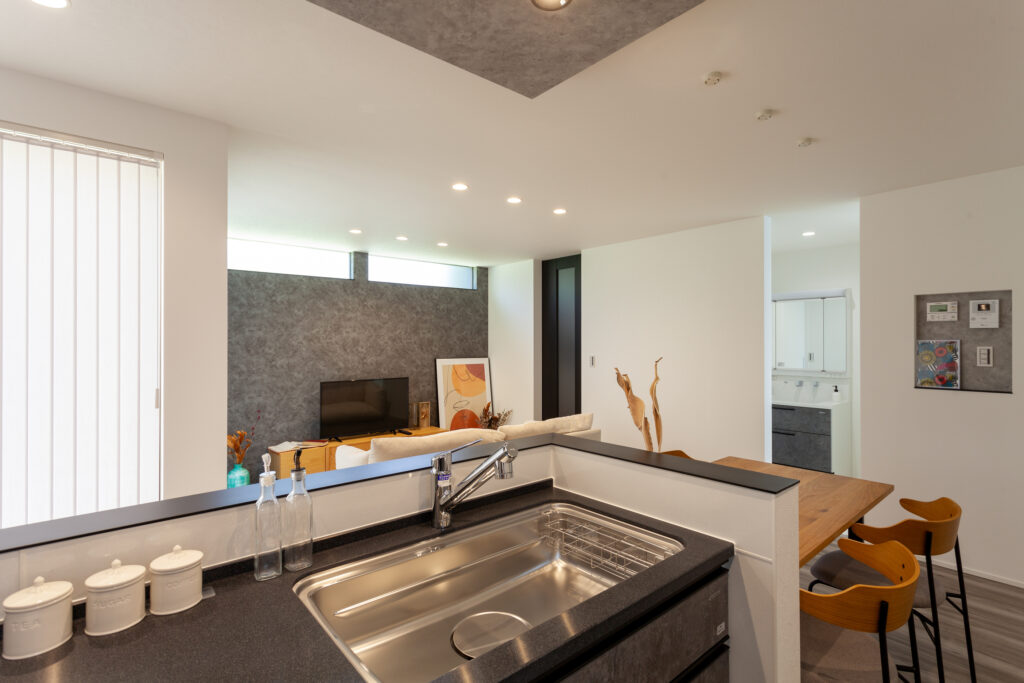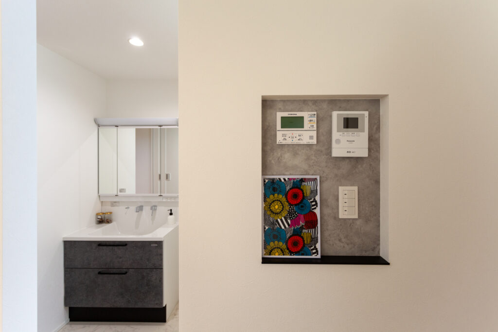 マコトホームの標準仕様をベースに、要所に施主様のこだわりを取り入れた、心地よい住まいが完成しました。1階には洗面室、脱衣室、ランドリールーム、ウォークインクローゼットをまとめて使い勝手のよい家事動線を実現。インテリアは、キッチンや階段などのアクセントにグレイッシュカラーを採用するなど、スタイリッシュモダンに仕上がっています。