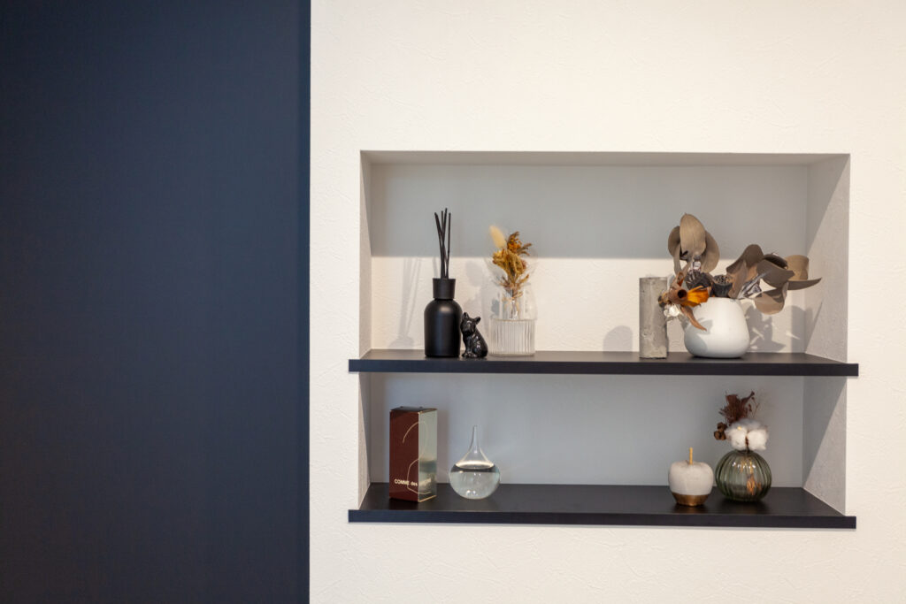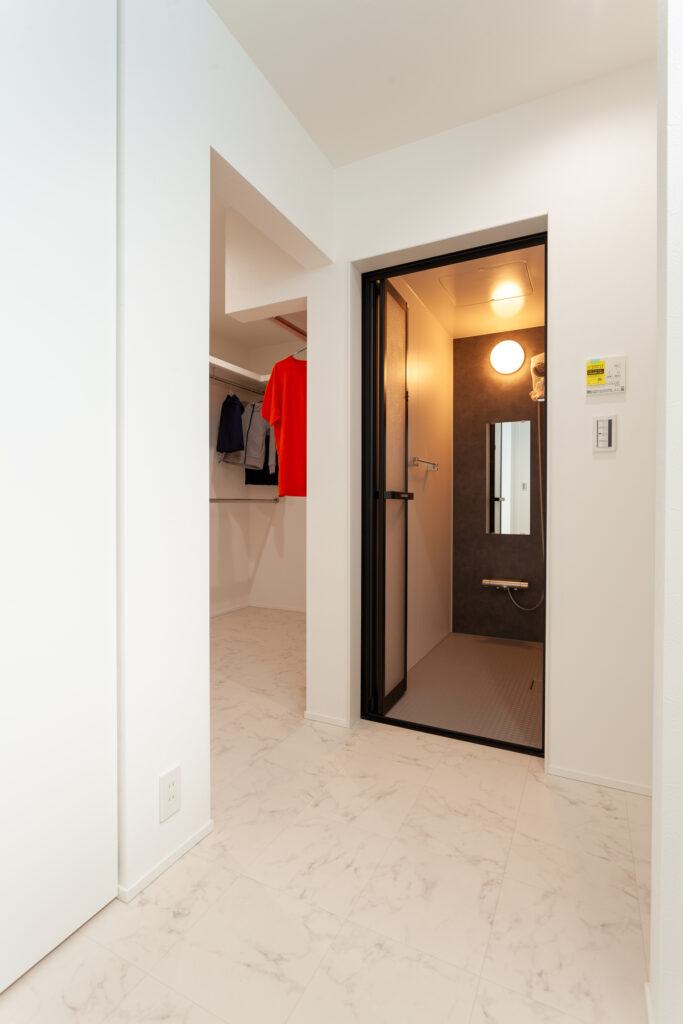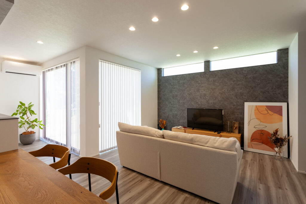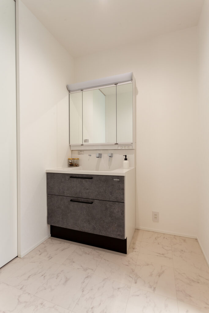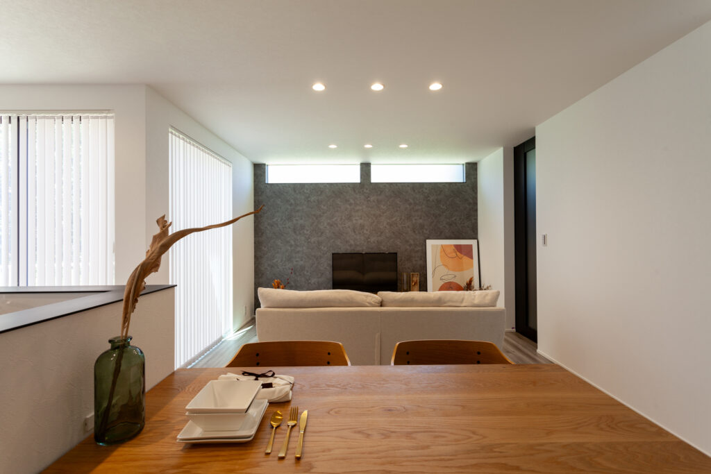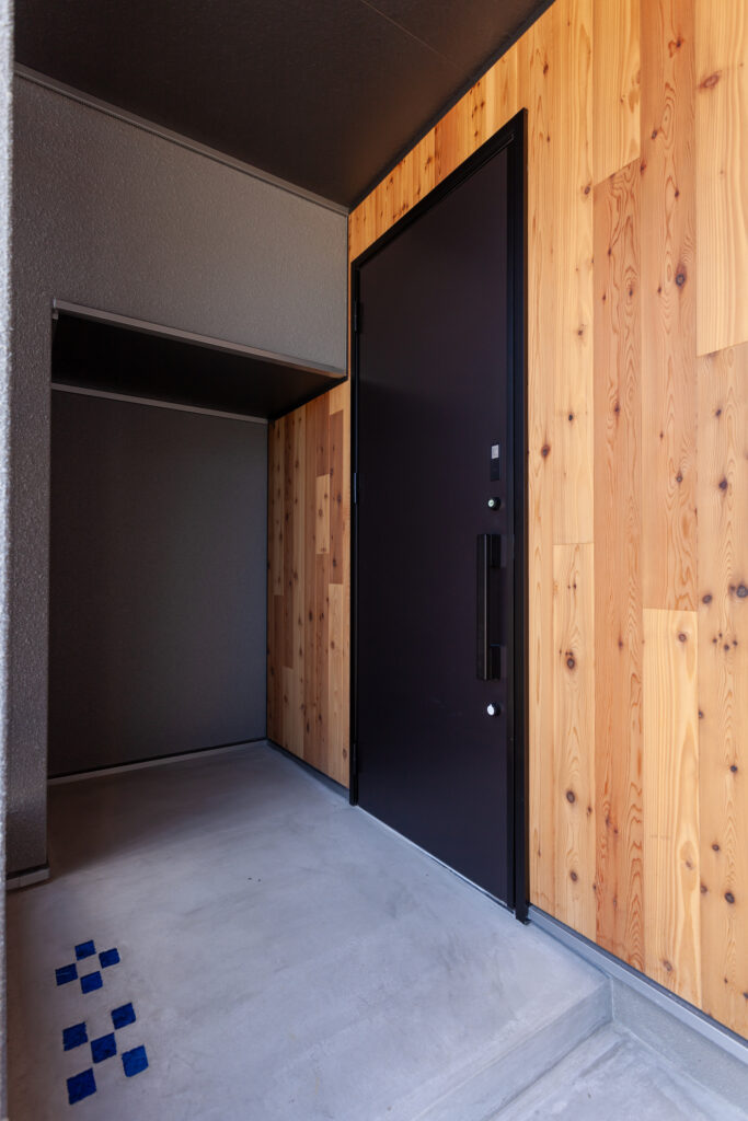 マコトホームの標準仕様をベースに、要所に施主様のこだわりを取り入れた、心地よい住まいが完成しました。1階には洗面室、脱衣室、ランドリールーム、ウォークインクローゼットをまとめて使い勝手のよい家事動線を実現。インテリアは、キッチンや階段などのアクセントにグレイッシュカラーを採用するなど、スタイリッシュモダンに仕上がっています。