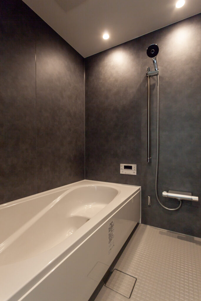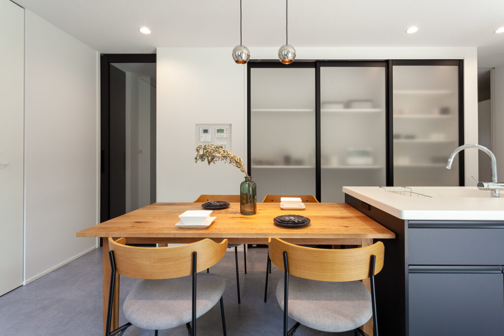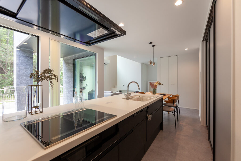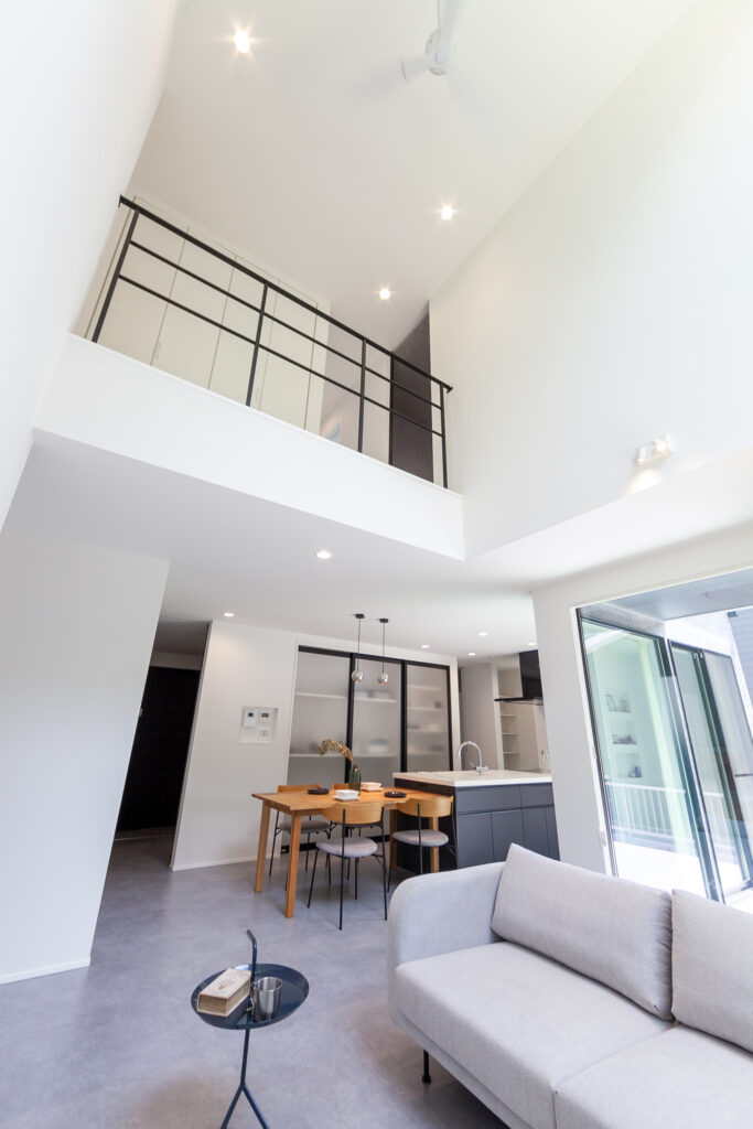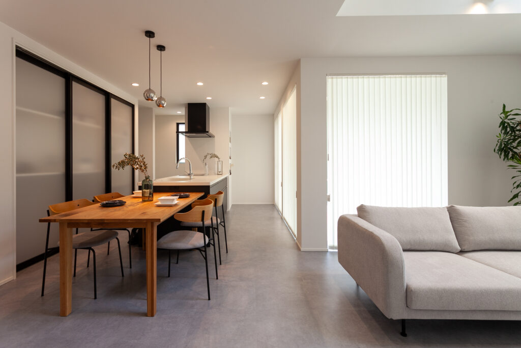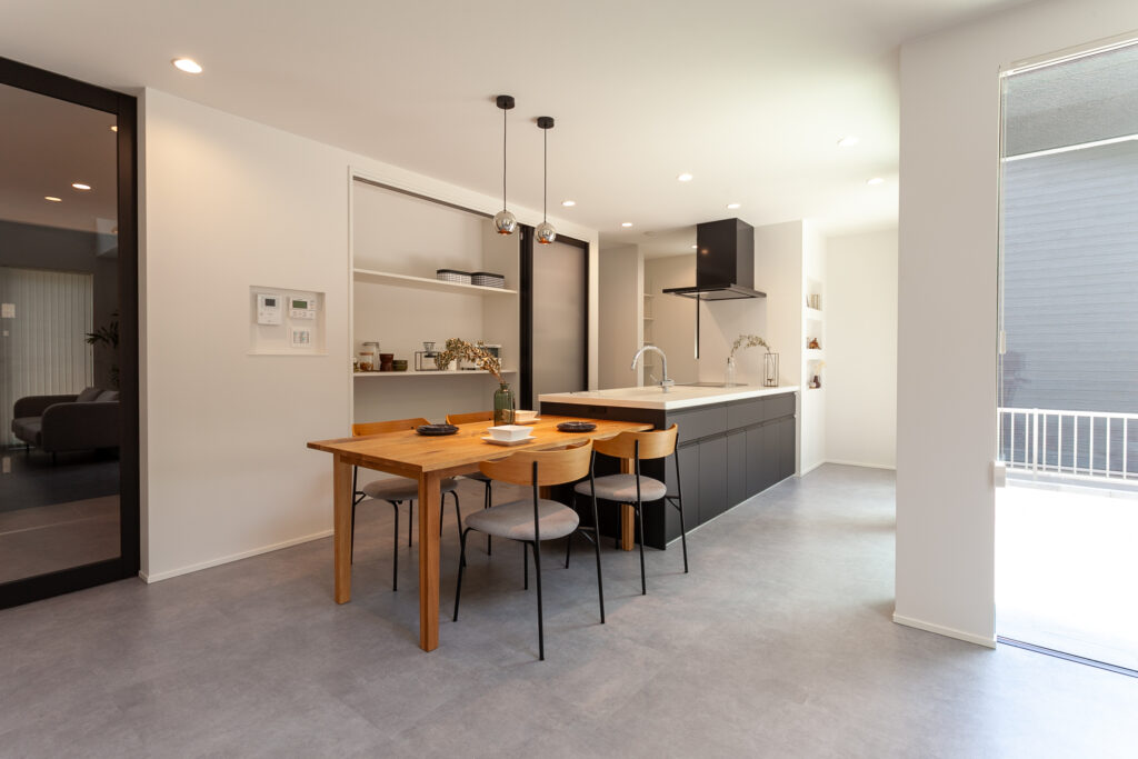 1Fはフロアタイルを採用し、ホテルライクな空間に仕上がりました。キッチンバックセットは隠せる収納で、生活感を抑えてくれます。LDKはリビングを吹き抜けにしたことでより空間全体に自然の光がたっぷりとはいります