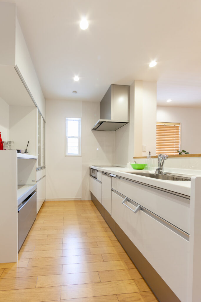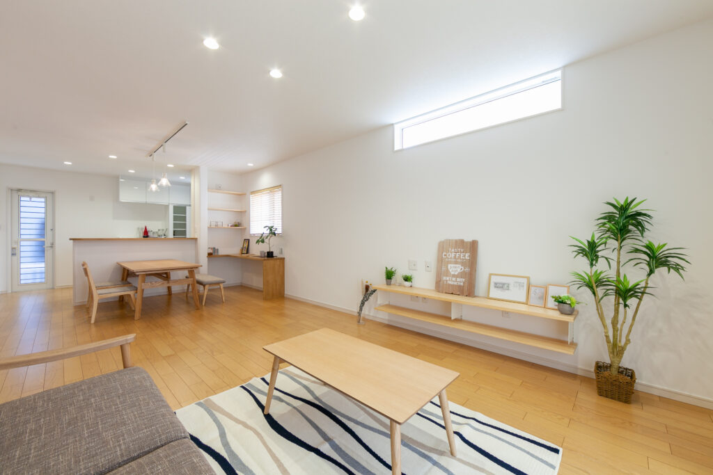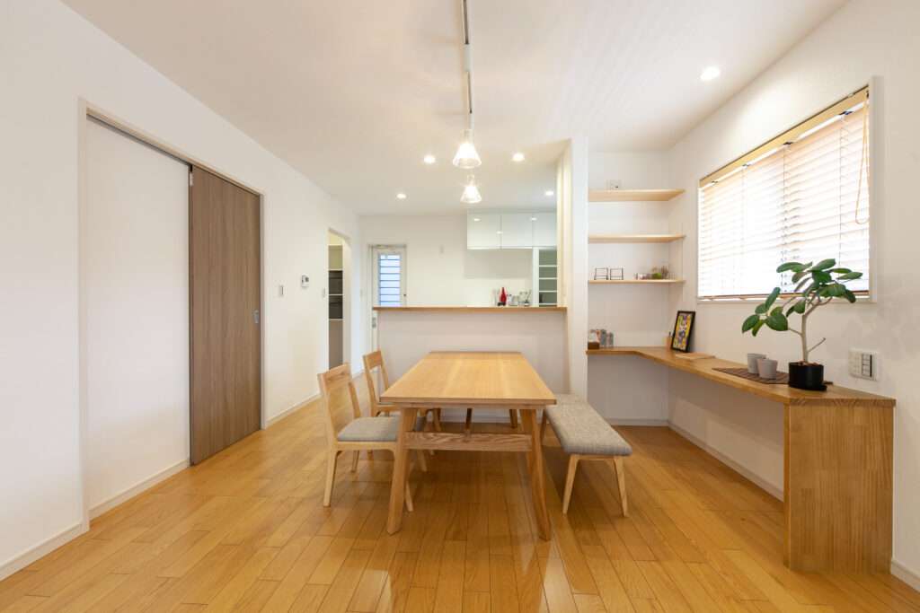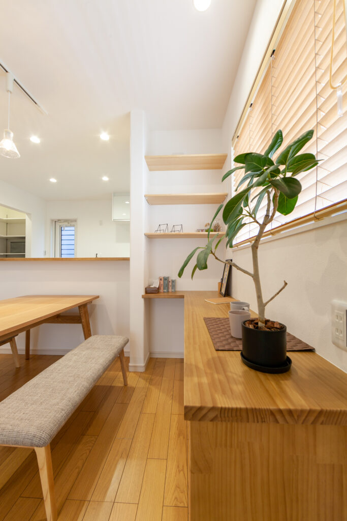テラスとルーフバルコニーのある家 リビング横にタイル張りのテラスと屋上はルーフバルコニーを設けたアウトドア志向な住まい。ダイニングのそばにはスタディカウンターを配置してありパソコン作業はもちろん、ちょっとした書類書きにも大活躍です。
