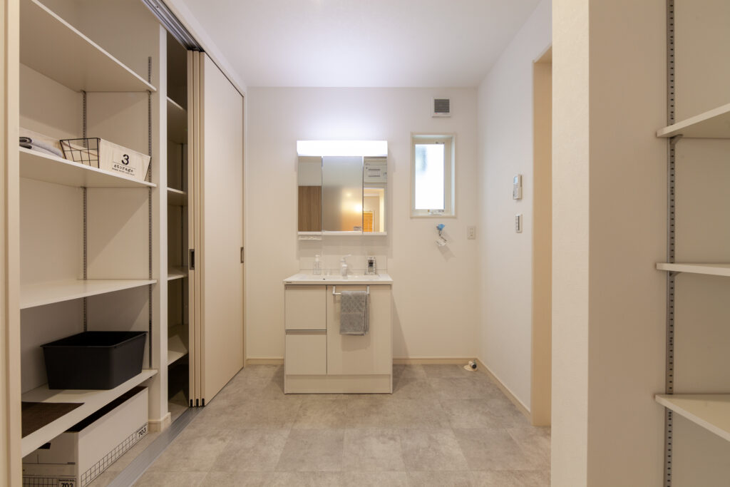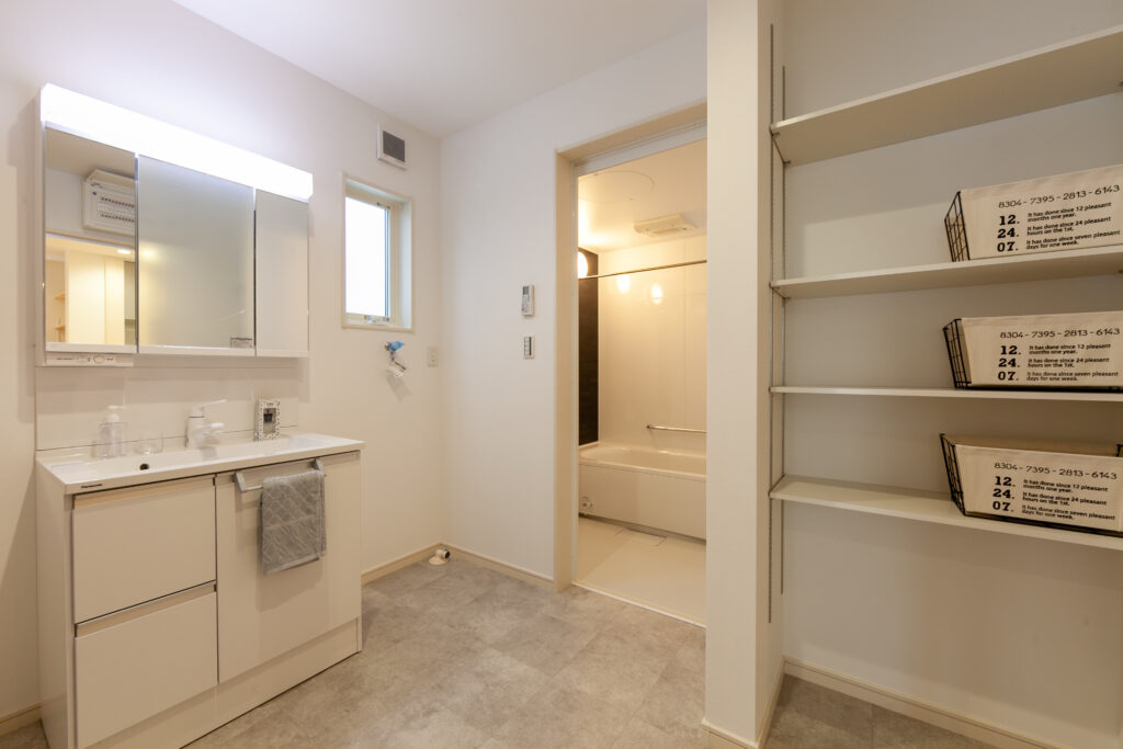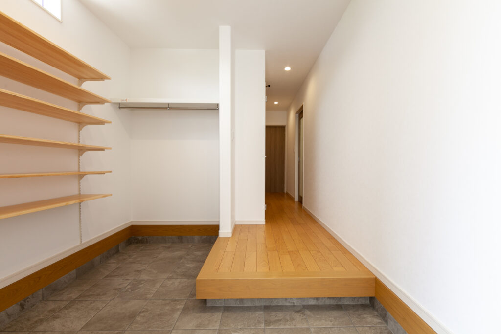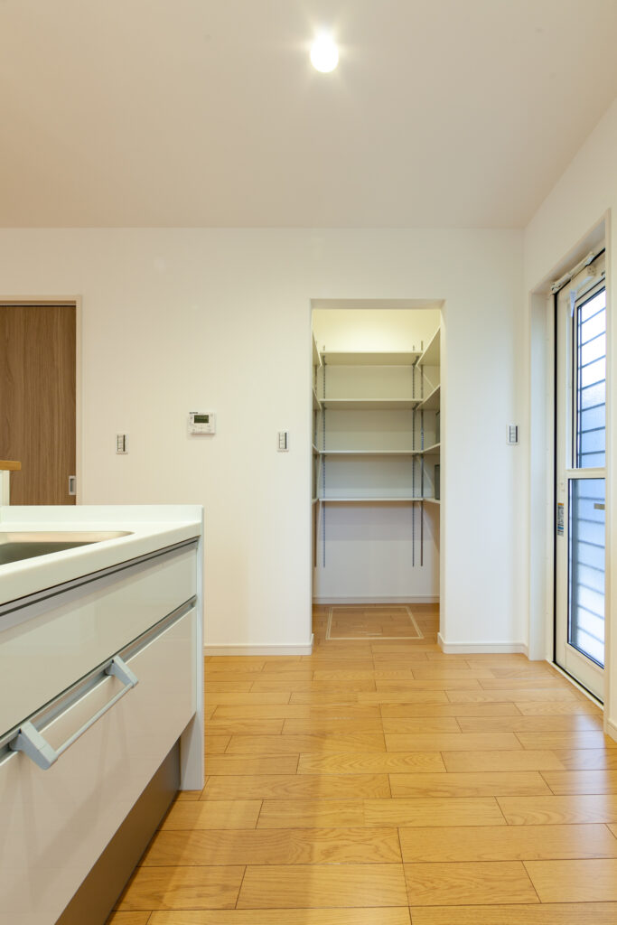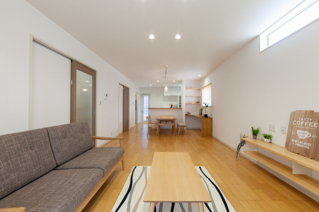テラスとルーフバルコニーのある家 リビング横にタイル張りのテラスと屋上はルーフバルコニーを設けたアウトドア志向な住まい。ダイニングのそばにはスタディカウンターを配置してありパソコン作業はもちろん、ちょっとした書類書きにも大活躍です。