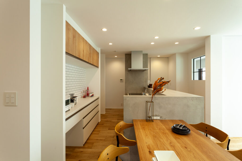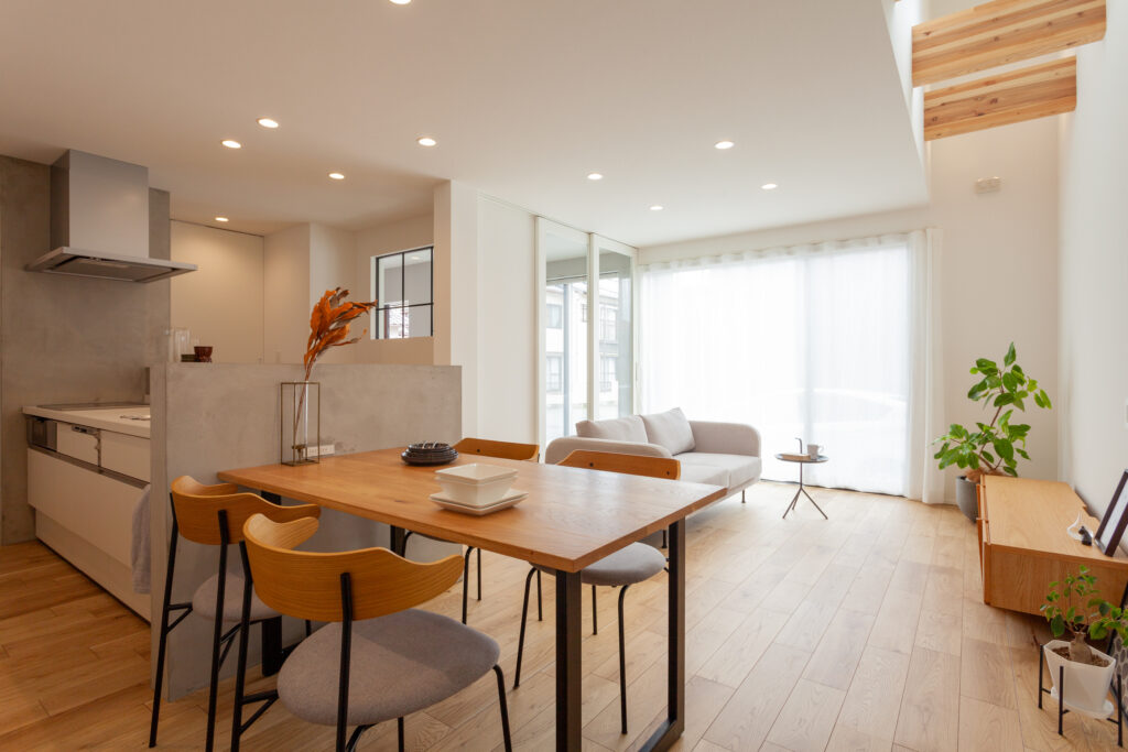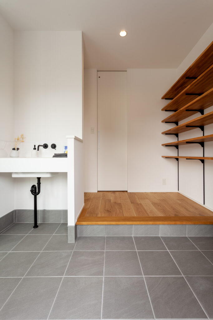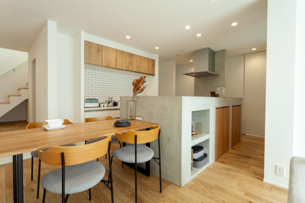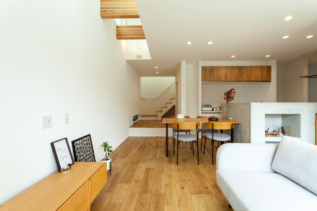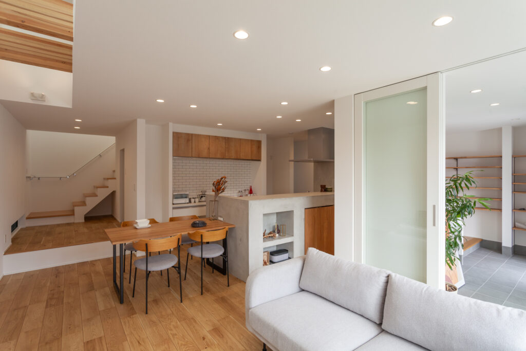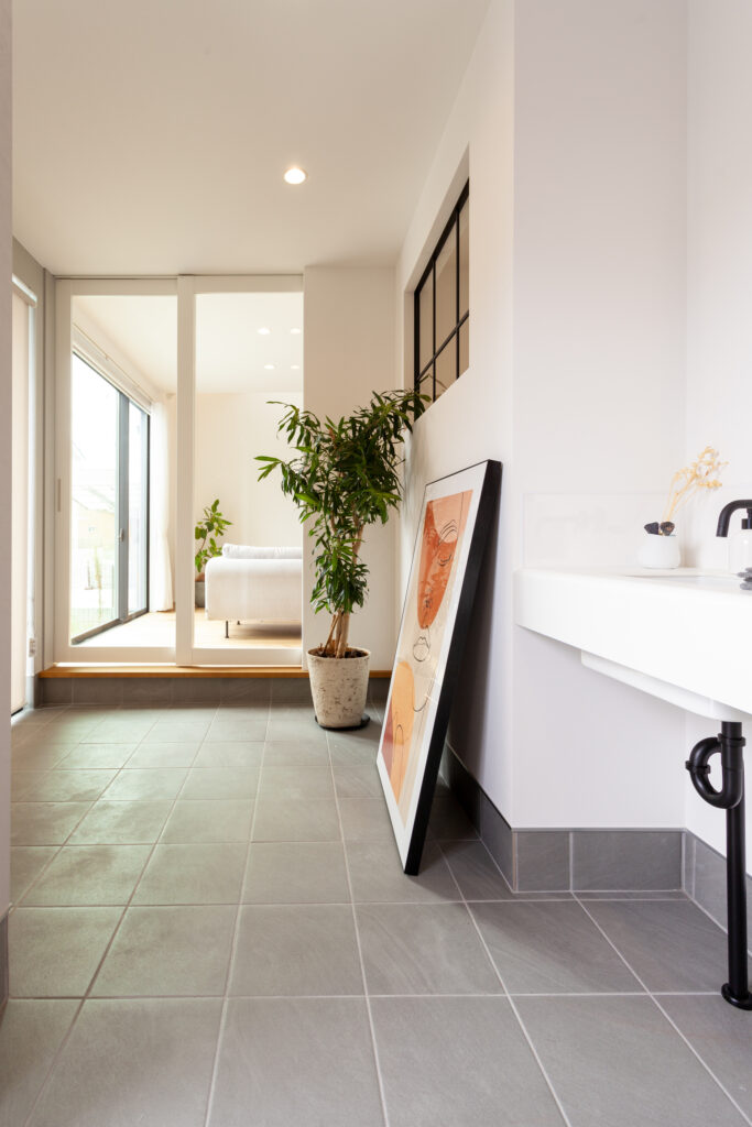 大きな土間ホールがあるお家 玄関を開けると、大容量の収納を設けた大きな土間ホールがお出迎え。自転車もスッキリおさまるほどの土間ホールには手洗いを設置。リビングは大開口の窓と吹き抜けでより広く感じられる空間になりました。キッチンはモルタル仕上げ。室内窓を採用し、キッチンにも光を取り入れてくれます。