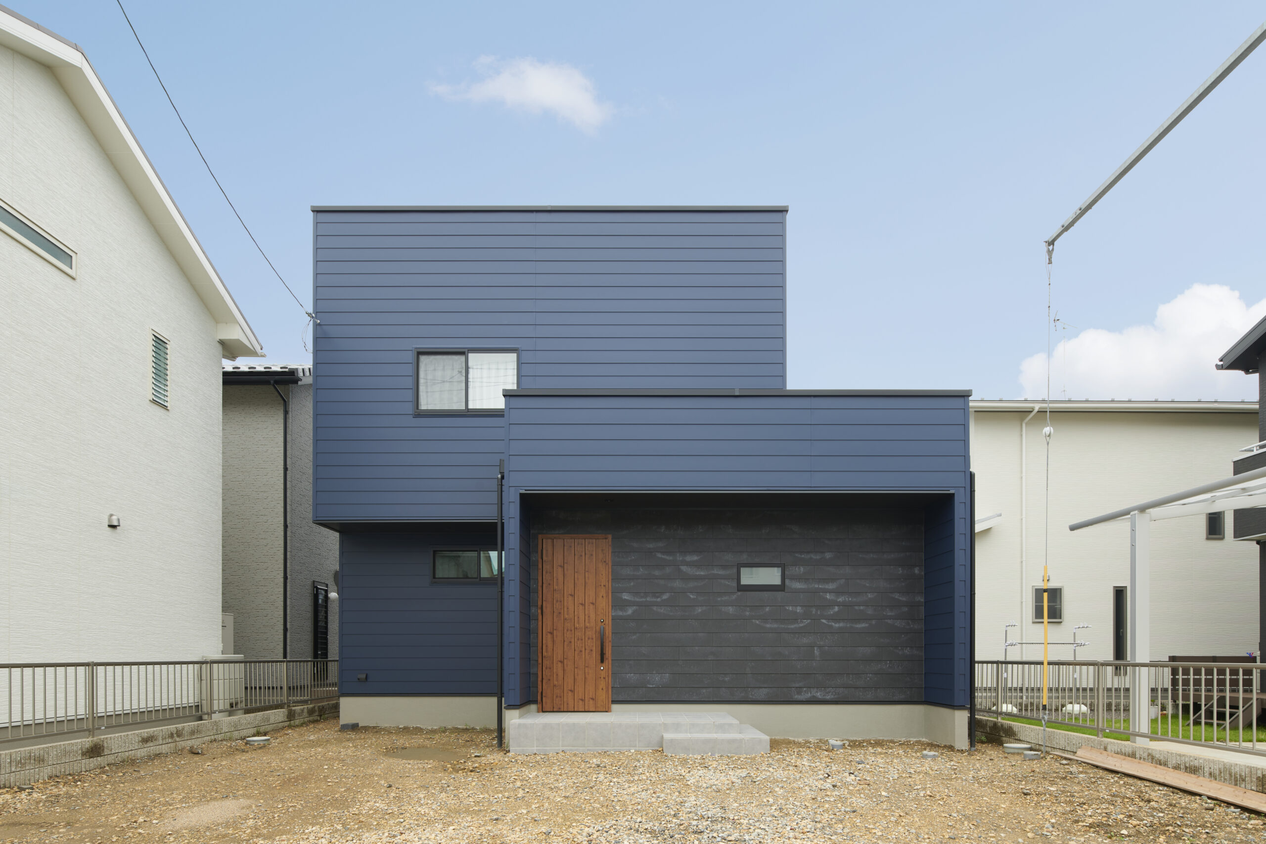 ネイビーのガルバリウム鋼板仕上げの外観。玄関は濃いグレーのモルタル風外壁材を貼り分けてアクセントに。