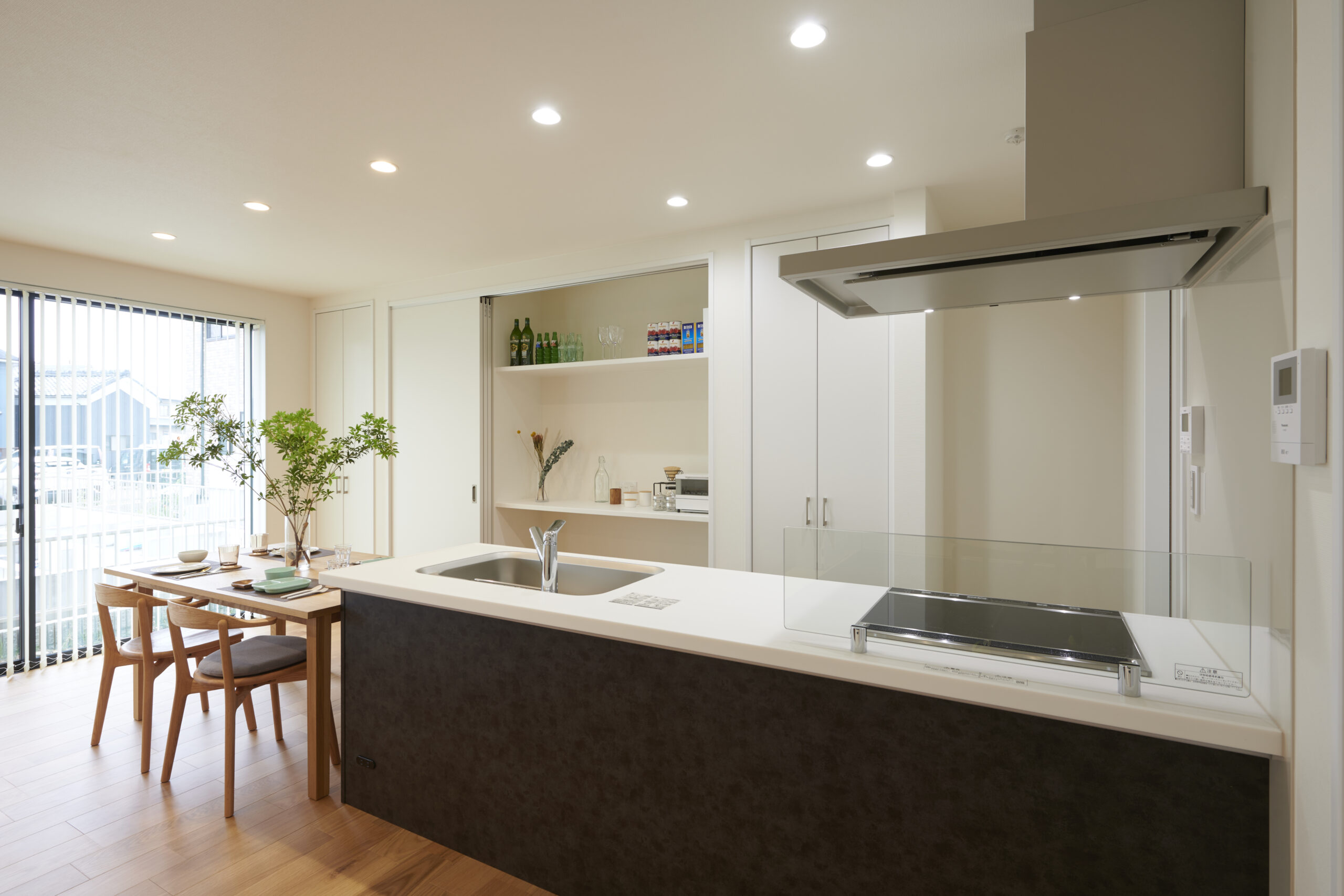横並びダイニングキッチンで、配膳・片付けスムーズ。壁面いっぱいの収納は、食器や調理家電などもすっきり仕舞える。